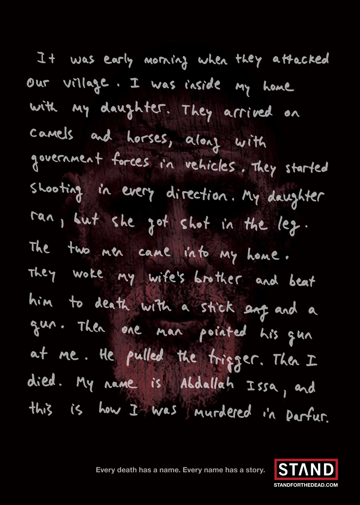 We created a poignant reimagining of the "Sponsor a Child in Africa" concept, inviting people to sponsor individuals who had already lost their lives in the conflict. Through their real names and true stories, told from beyond the grave, we gave these lost voices a chance to be heard and remembered.